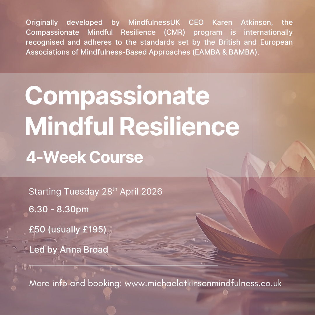 I offer two main courses: Mindful Compassionate Resilience (CMR) - 4 Week Course and Mindfulness-Based Stress Reduction (MBSR) - 8 Week Course